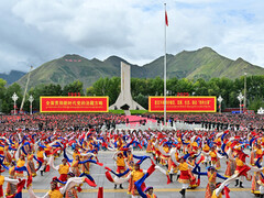新华社飞机飞越青藏高原,飞向西藏拉萨。 透过舷窗俯瞰,重重高山、亘古江河之间,高速公路似巨龙翻山越岭,水网交织的雅鲁藏布江蜿蜒奔腾,拉萨河谷植绿成林、换了人间,世界屋脊上挥就历史性笔墨。 “手捧洁白的哈达,这是一条天上的白云”“这是我们的颂歌,这是新时代的祝福”……海拔3500多米的贡嘎机场成为欢腾的海洋。 西藏自治区成立60周年之际,8月20日,习近平总书记率中央代表团来到拉萨,同西藏各族人民共同庆祝